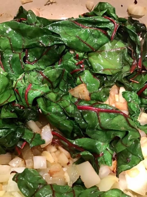 Then add your beans, minced garlic and the Swiss Chard leaves, cook for four minutes and swirl the mixture around every once in a while.