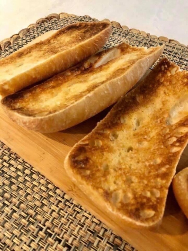 Take your baguette, cut in half, brush olive oil on both sides, add salt and pepper. Place in a pre-heated oven of 425 degrees for around 10 minutes, till the baguette is nice and brown. Then cut up into slices.