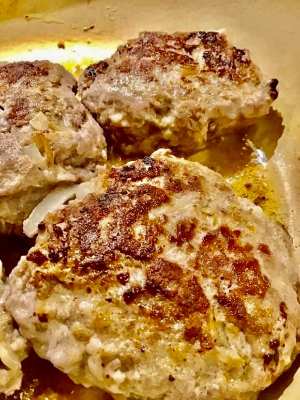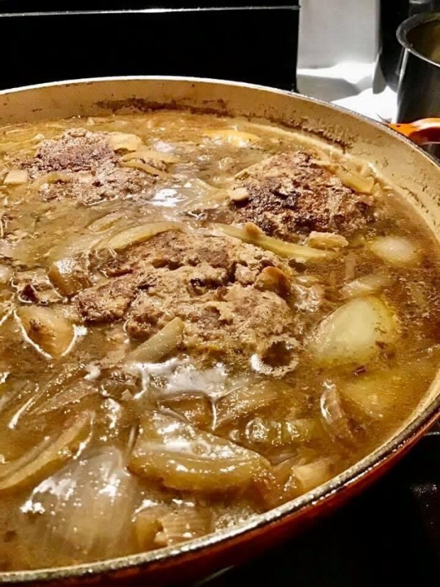 Add three more tablespoons of olive olive to the same pan and then add your onions. Season with salt and pepper to taste. Cook and stir for a few minutes on medium heat. Once the onions are translucent add the thyme and stir. Now turn the heat down to medium low and let the onions cook for 20 minutes or so, stirring every once in a while. Once the onions are nice and brown add your beef stock. Turn heat to high and boil for about two minutes, then add your beef patties and turn heat to simmer. Cook for 10 minutes.