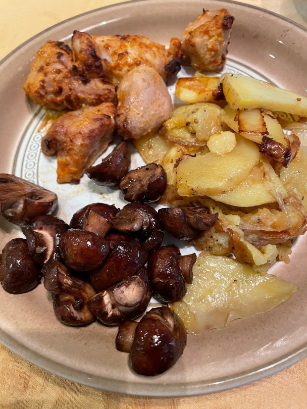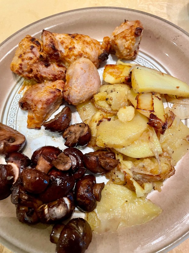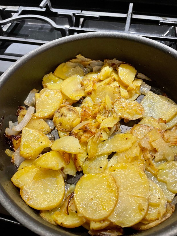 Peel your onion and then cut into thin slices. Once done add to the frying pan. Now turn on your oven element to low for five minutes. Then turn up your heat to medium low, again mixing the potato-onion mixture to ensure it does not burn. The whole process will take at least 30 minutes with you watching so nothing burns. You might have to increase or decrease the temperature to ensure the potatoes stay golden brown. At some point add salt and pepper, mix and then taste one of the potato slices with some onion on it and add more salt and pepper if needed.