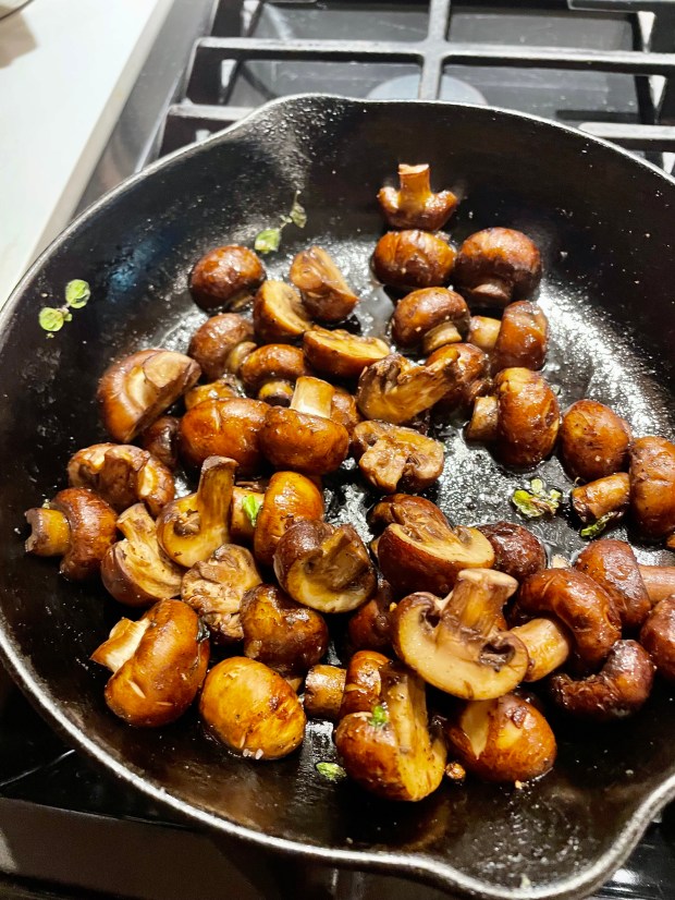 Now take your mushrooms – making sure they are clean – cut them n half and then add into a cold frying pan. Take the sprigs of thyme and oregano, strip them of their leaves and throw into the mushrooms.