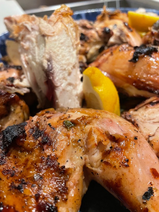 Watch your chicken like a hawk for the first few minutes and flip the bird if the skin starts to char. When the chicken is lightly colored, or after 10 minutes, flip it over and baste with the reserved marinade. Close the lid on the grill and cook for 30 to to 40 minutes. But check the chicken every three minutes to make sure it is not burning.