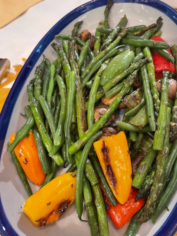 Your chicken, sausages, peppers, asparagus and green beans, all will be done at the same time. Turn off the BBQ heat and close the lid, letting the chicken, the sausages and the veggies rest for about 7 minutes.