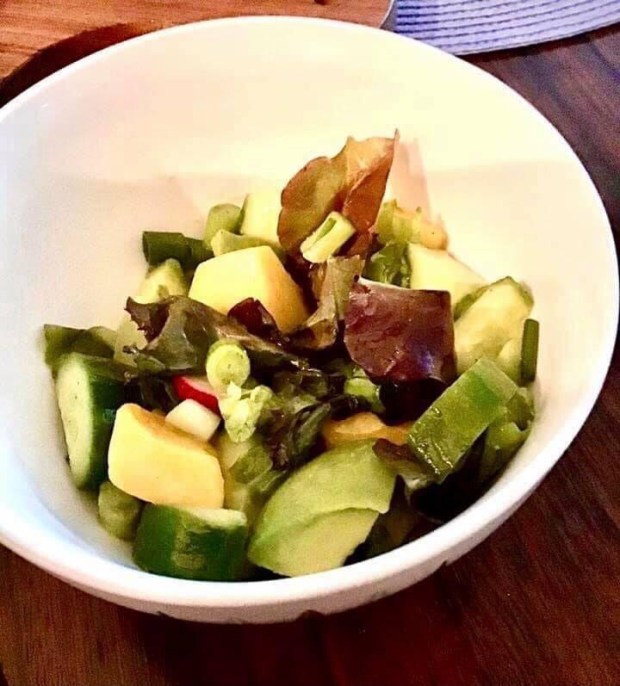 Put all ingredients, including the cut up mangoes, into the bowl where the lettuce is in.