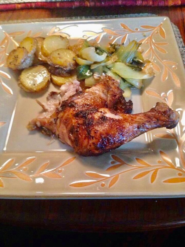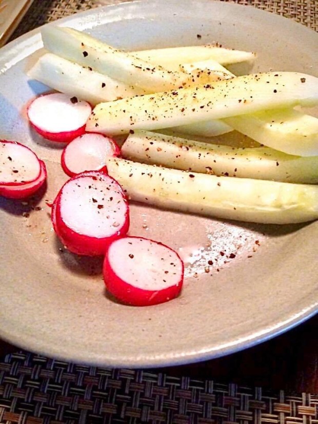 We served with Bok Choi, pan-fried potatoes and sliced radishes and cucumbers with salt and pepper.