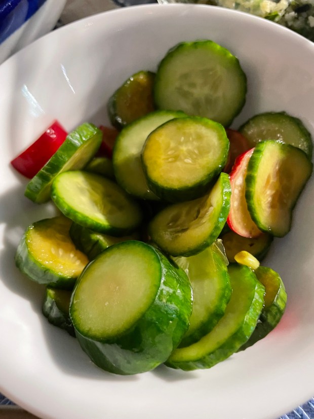 Peel your cucumber and cut into medium-sized slices, cut your radishes into thin slices. Add the two into a small bowl. Then add your Ponzu sauce, season with salt and place in refrigerator.