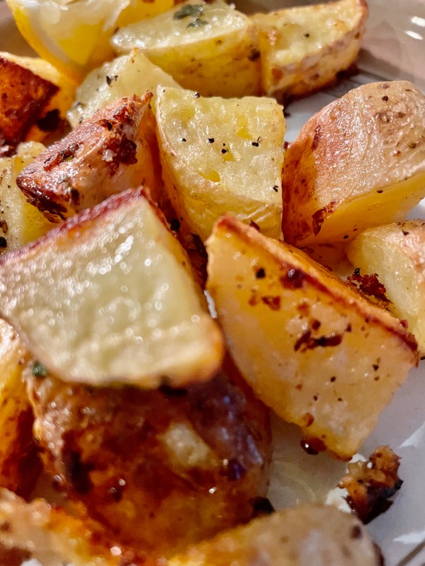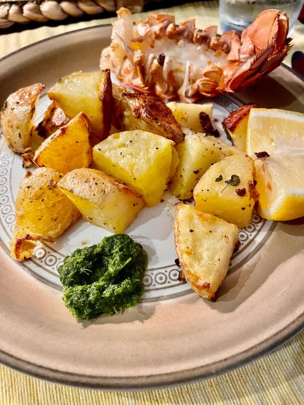 When the potatoes and lobster tails are done, take them out and squeeze lemon juice over the lobster tails.