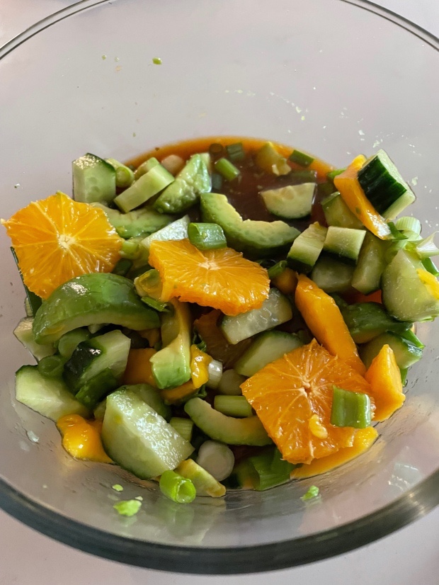 Mix everything in the bowl and then add the lime juice, olive oil, soya sauce. Mix everything thoroughly.