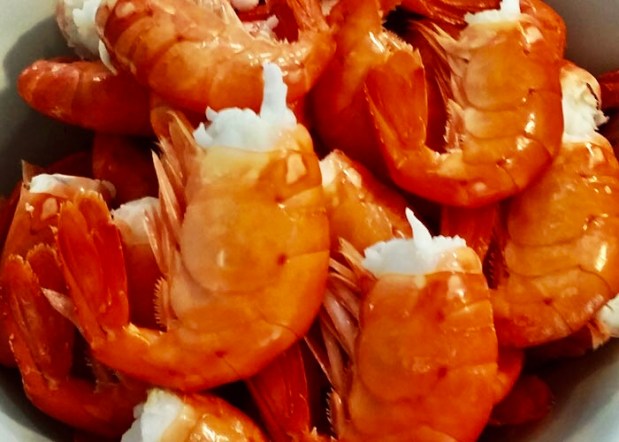 Fill a large pot with water. Bring to a rapid boil, then add the prawns. Let them boil at a full boil for 1 1/2 minutes. Then remove and set aside.