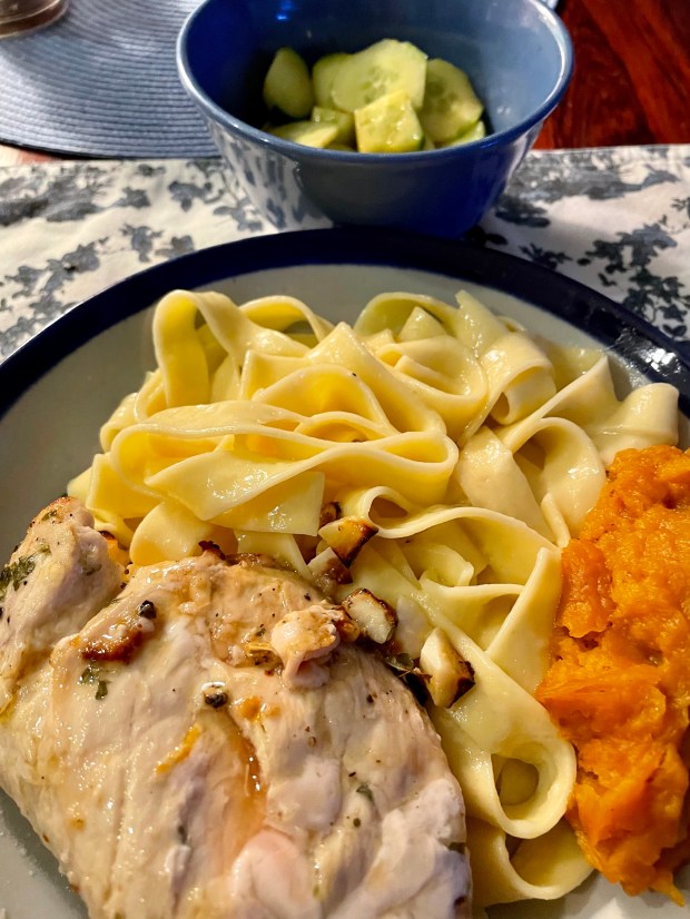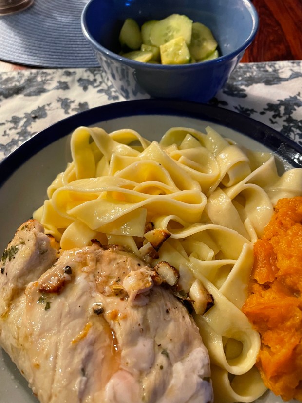 Pan-fried chicken breasts, kissed with some lemon, butter. The pasta bathed in butter, grated cheese added.