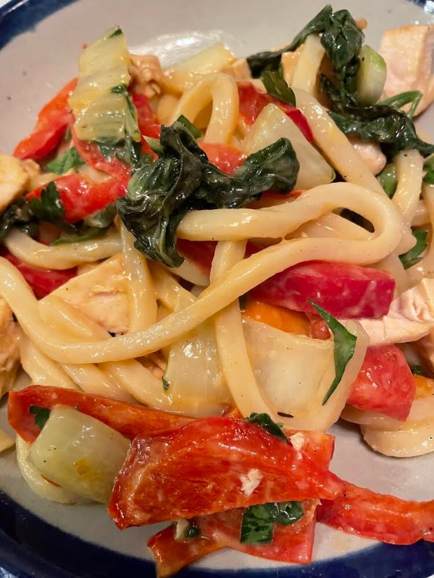 This dinner serves two and is a delight with the Udon noodles bathed in a delicious sauce, steamed sliced chicken, juicy and succulent, all coming together with different vegetables.
