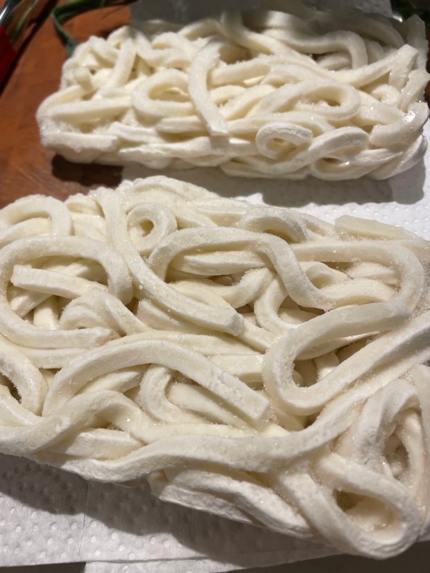 2 frozen portions of frozen Udon noodles. The noodles usually are packaged in three portions.