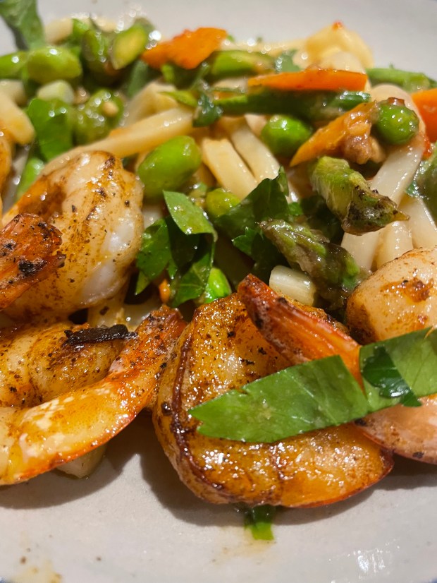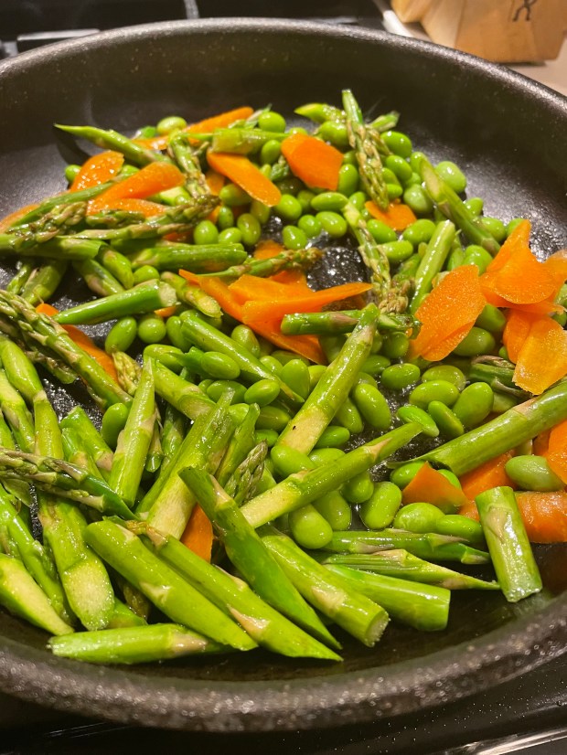 Clean up your veggies, breaking off the stems of your asparagus stalks, then slicing them diagonally. For your carrot, slice it thinly in long strips. Cut the ends off your green onions and their tops so that only the fresh green parts remain, then slice diagonally. Slice your garlic thinly. Take out your frozen Edamame beans. Set all vegetables aside.