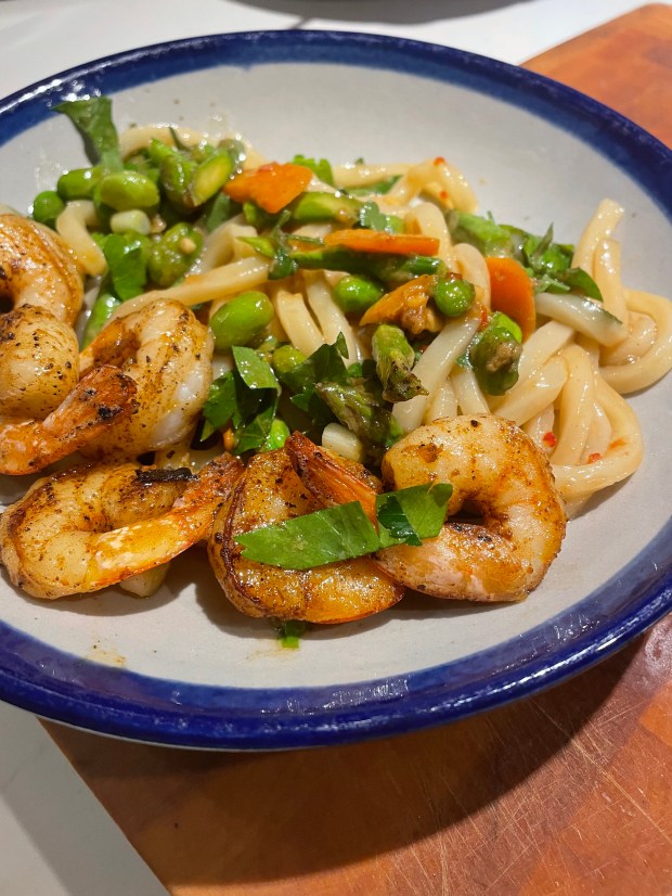 Oodles of Japanese Udon noodles, bathed in a tangy sauce, fresh vegetables their taste intact and shrimps with a spicy sauce.