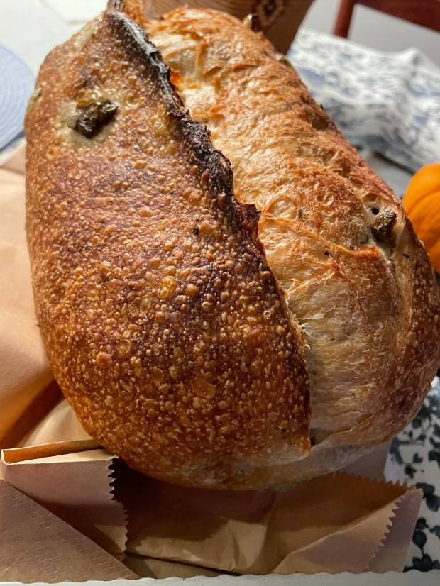 A slice of rustic, crusty on the outside, chewy on the inside with salty olives throughout., bread; a great accompaniment to this delightful dinner.