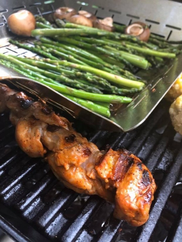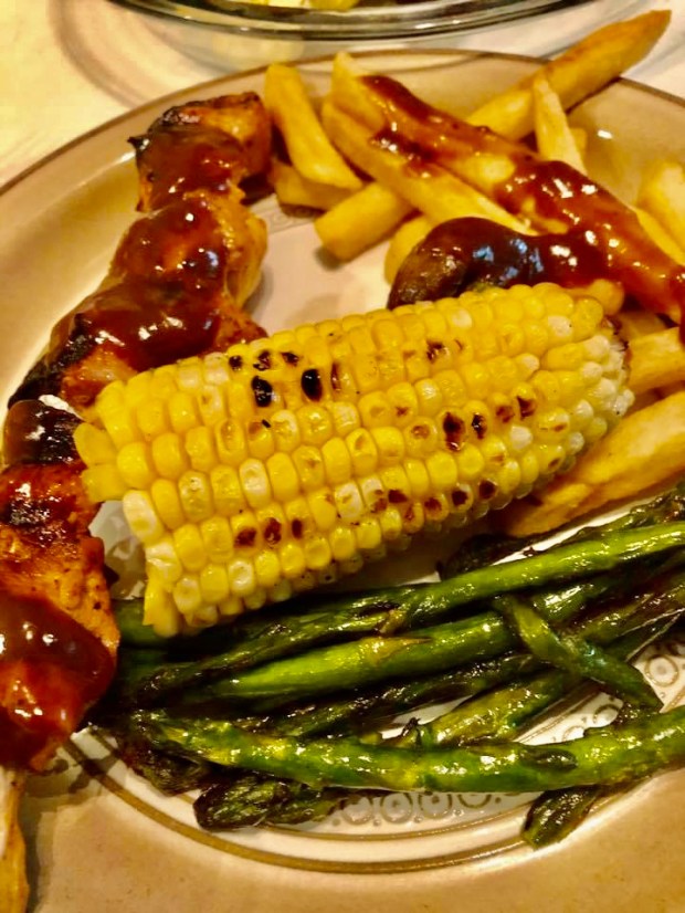 This meal is an explosion of different flavours and textures. The BBQ pork kabobs are spicy and tangy, having marinated in Korean BBQ sauce. The grilled mushrooms have a nice woodsy taste, and the corn is sweet with a touch of char to it. The asparagus is crunchy.