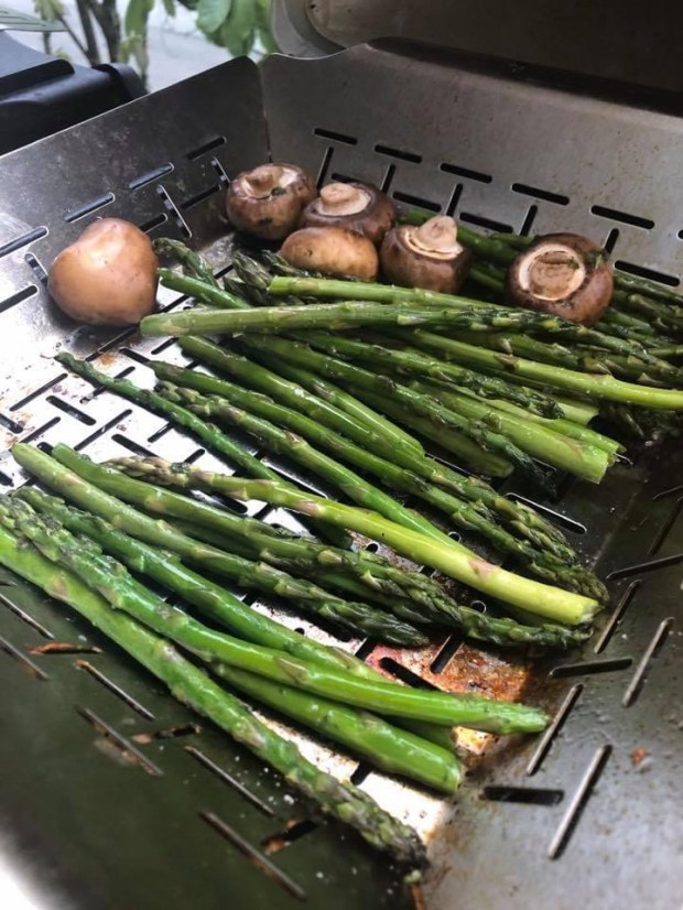 At the 10 minute mark add your mushrooms, asparagus and kabobs on to the BBQ and cook for 10 minutes.