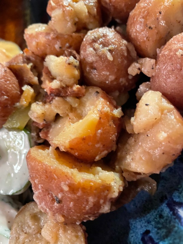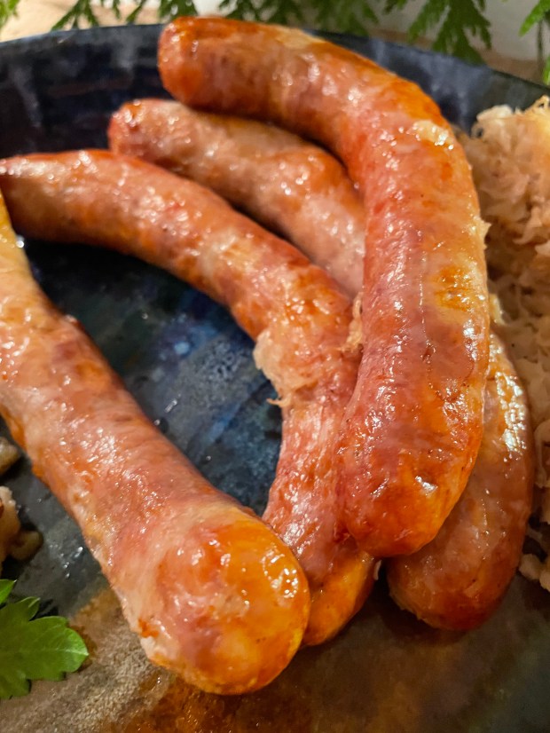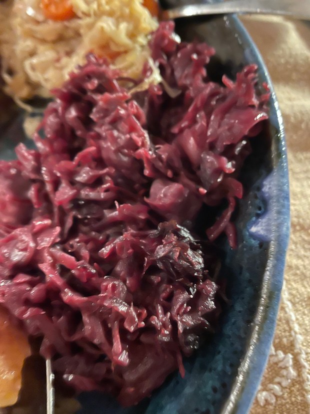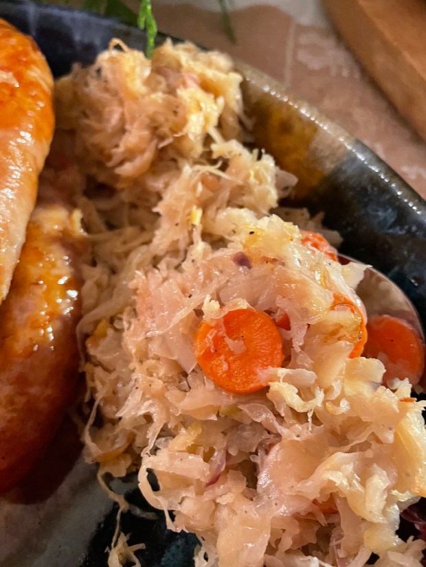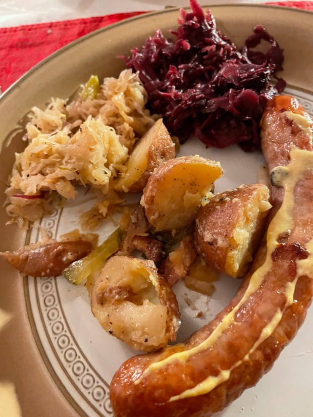 This is a common German dinner – easy to make, no muss, no fuss. It serves two. Great food is the sum of all of its parts and this is right there. The sausages are juicy with that robust pork taste, complemented by a terrific German style mustard. The potato salad with bacon is hearty and delicious. The sauerkraut works perfectly well with the red cabbage.