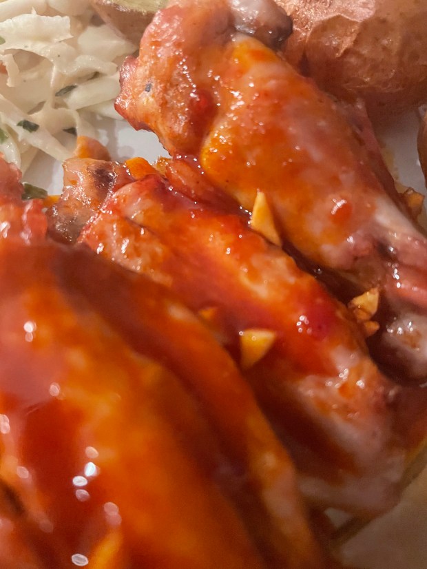 There will be lots of sauce left that can be used as a dipping sauce for the wings and some of it over the potatoes also is yummy.