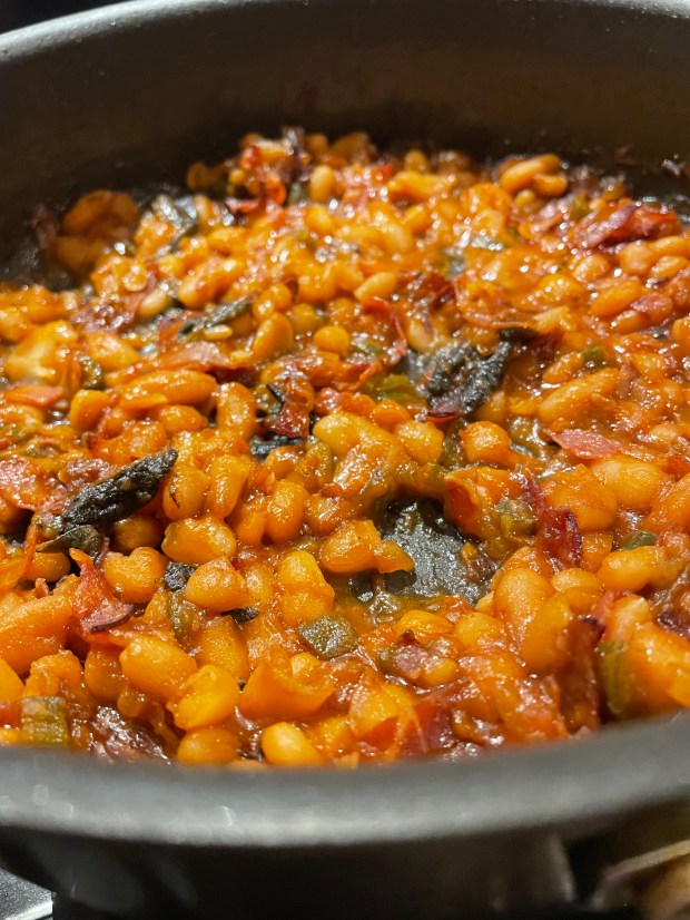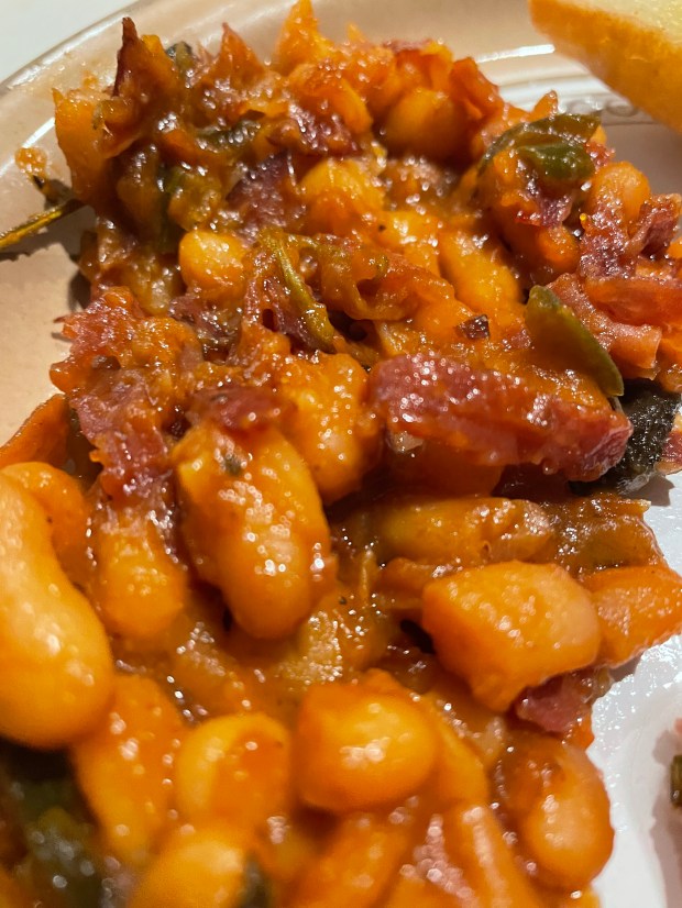 This dinner is for two. The beans are out of this world – a bit sweet, rich and luscious, the bread crusty.