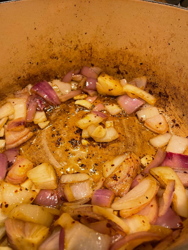 Now put your onions and carrots into the Dutch oven on low medium heat, till the onions have browned nicely.