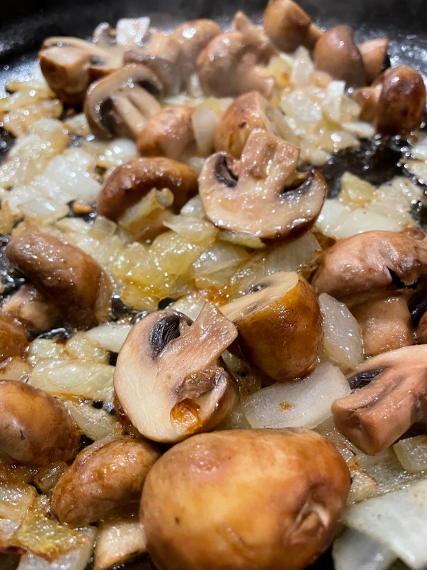 f into small slices and chop those onions into small pieces. Add them into a frying pan, three tablespoons, salt and pepper to taste, turn heat on on stovetop at medium low. Every once in a while move mushrooms around with a wooden spoon. It will take about 10 minutes for the onions to be soft and sweet. Set aside in a bowl.