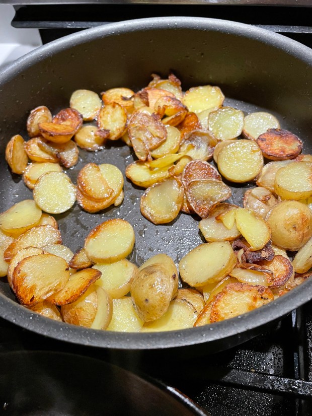 Now take one of the frying pans – add 3 tablespoons of your olive oil, heat oil on medium high, then add the potatoes. Move the potatoes around for a few minutes, making sure they don’t burn. Then turn heat down to medium low and every once in a while turn the potatoes over. Taste one of the potatoes to see how much longer you need to fry them. As a rule these potatoes take about 20 minutes to be ready for serving. The biggest challenge is to.make sure the potatoes don’t burn, adjust the heat level on your stove top accordingly.