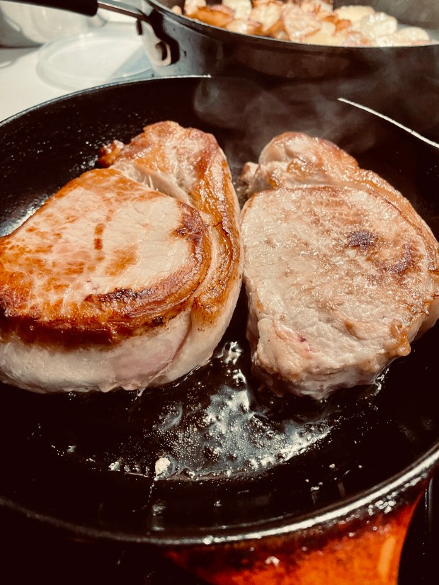 This dinner is for two. Juicy, succulent pork chops, doused with a sauce that is combination of sweet, a bit spicy, accompanied by earthy mushrooms, sweet onions and crunchy, soft, pan-fried potatoes.
