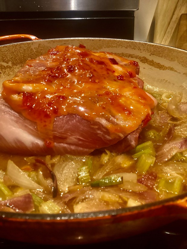 Add the garlic to the small bowl, then the sweet Thai chilli sauce, the soya sauce, the brown sugar. Mix well. Add salt and pepper to taste. Set aside. This sauce is the glaze for the pork roast.