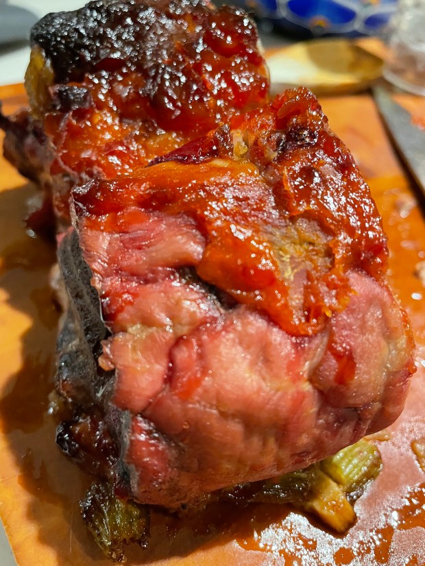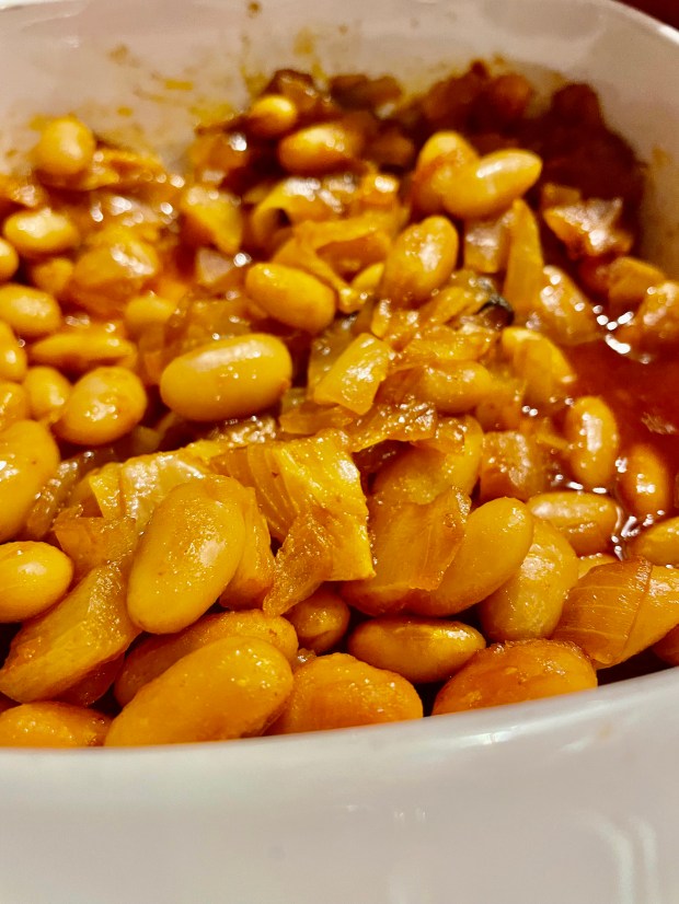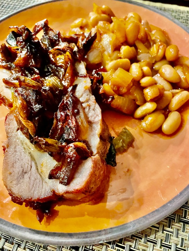This dinner is for two. The beans are out of this world – a bit sweet, rich and luscious. The pork shoulder moist, juicy, the glaze packing a flavour punch.