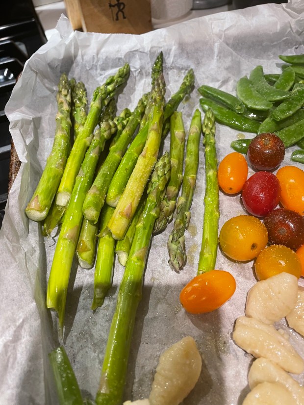 On the larger pan add your gnocchi, tomatoes, asparagus and snow peas. Drizzle the olive oil over everything and with your hands make sure all items are covered with oil. Add salt and pepper, to taste.