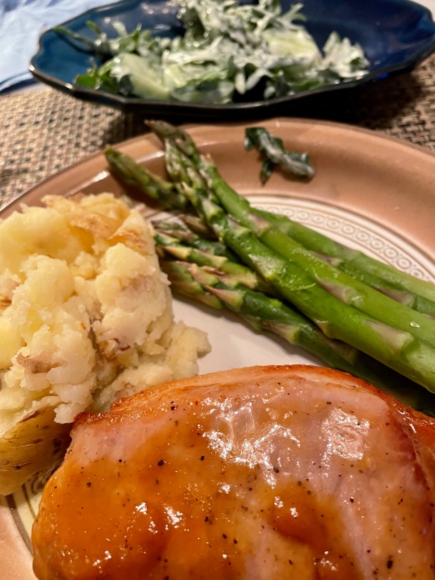 Luscious, rich tasting, chicken thighs covered with an amazing sauce are perfect with the earthy, garden fresh, taste of the asparagus and creamy, delicious mashed potatoes, all add up to a great meal. The salad cuts through the richness of the chicken.