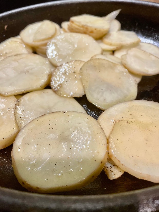 Take your potatoes, wash them, don’t peel them, and cut into thin slices. Add them to the frying pan you used for the onions, add the two tablespoons of olive oil and turn up heat to medium. Now use your wooden spoon to swish them around, ensuring that all of them have oil on them. Reduce the heat to medium low, every once in a while, mix the mixture with your spoon. Make sure the potatoes don’t burn. You may have to turn down the heat. In 20 minutes your potatoes should be ready, but make sure you taste a few of them, this will give you a good idea how long it will take before they are ready. Once done season with salt and pepper to taste. Take your potatoes out and put them on the same plate where the onions are.