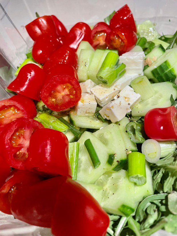 Take three tablespoons of your olive oil, vinegar and Feta brine and add to the bowl, season with salt and pepper, to taste. Set aside and put in the refrigerator. When ready to serve take out of the fridge and mix the salad well.