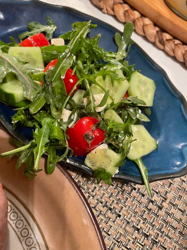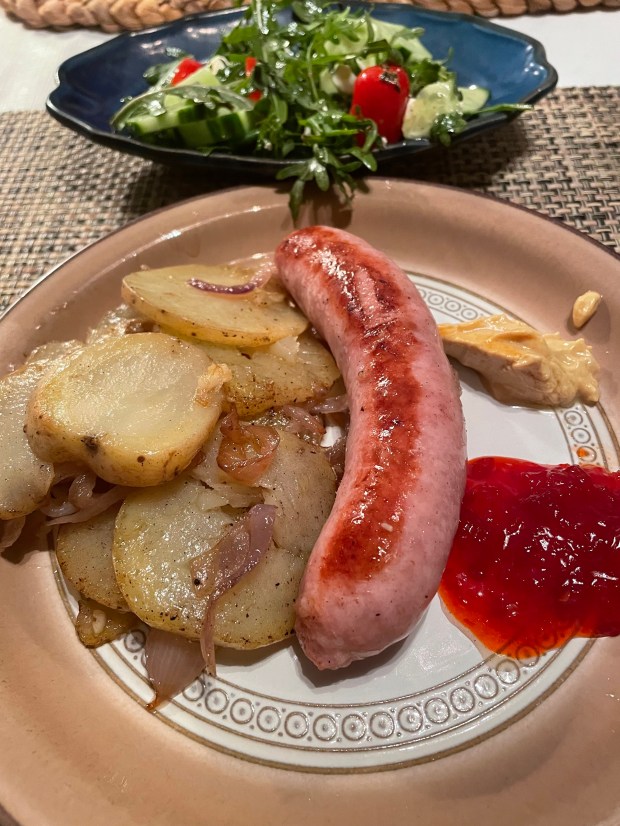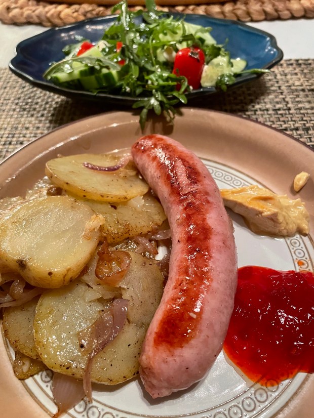 This dinner is for two – the pan-fried potatoes are creamy with some bits crusty and brown, caramelized onions with some garlic, make the potatoes rich and hearty, the sausages are also hearty, but a nice Dijon mustard and some chilli marmalade add extra flavour dimensions. The salad is light, refreshing, the Feta cubes, adding a bit of a briny taste.