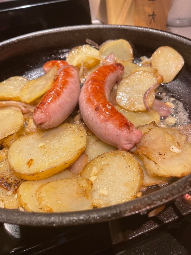 Now take your two sausages – with the heat on medium – add your two tablespoons of butter and fry the sausages. Turn them over every once in a while to make sure they are nice and brown. Again watch your heat so nothing burns. At the 15 minute mark, add the potatoes, onions to the frying and cook everything for another five minutes, making sure that by using your wooden spoon to move everything around it will be nice and warm.