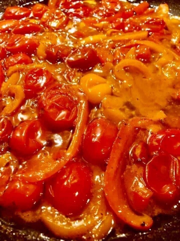 Put your tomatoes, peppers, sugar and thyme into the pan.