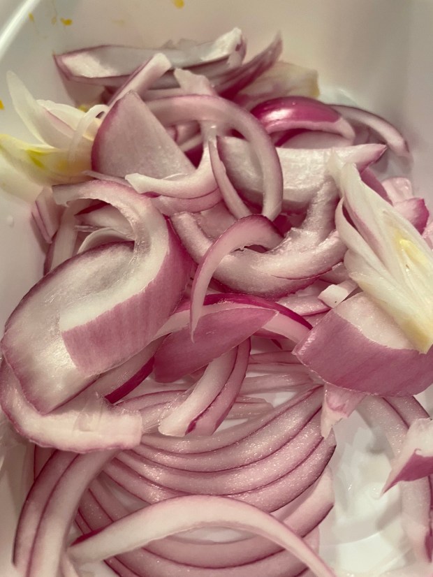 Place the meat on your dinner plate – add your egg yolk on top of the meat and with a fork gently break up the yolk and mix slightly into the steak. Then add some onion slices and the cut up tomatoes.