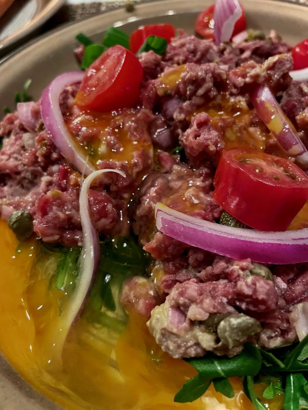 Crusty bread, minced beef, creamy egg yolk, briny capers, earthy Worcestershire, and sweet onions, each contributing to this classic French dish.