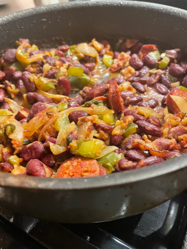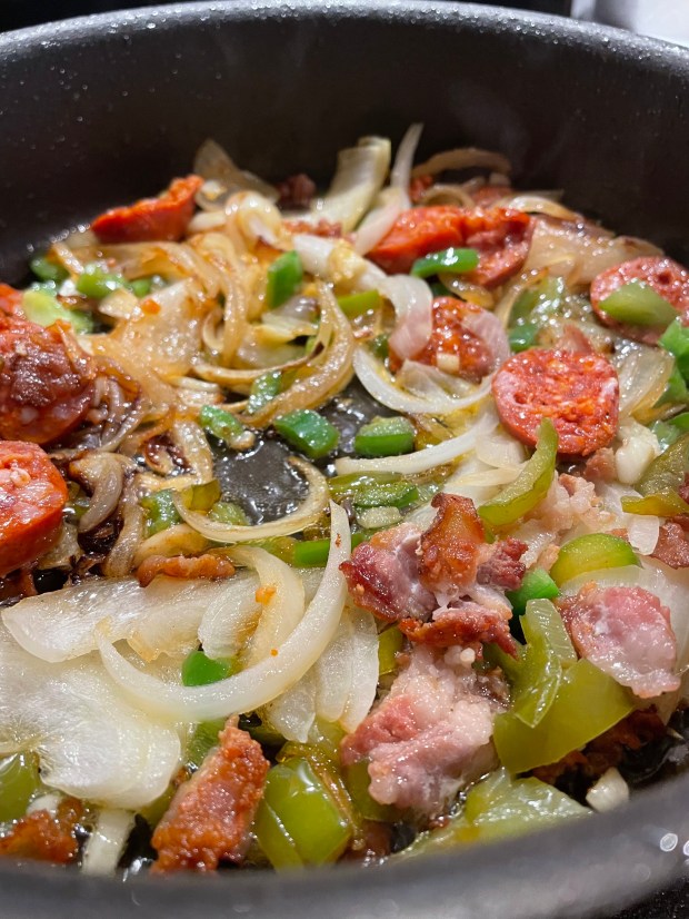 It is rich, hearty, satisfying, the peppers adding crunch.