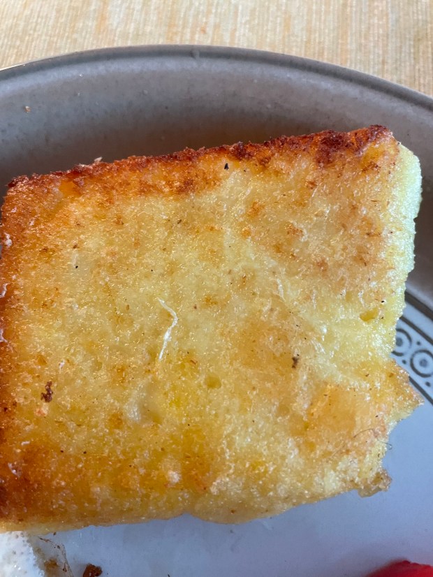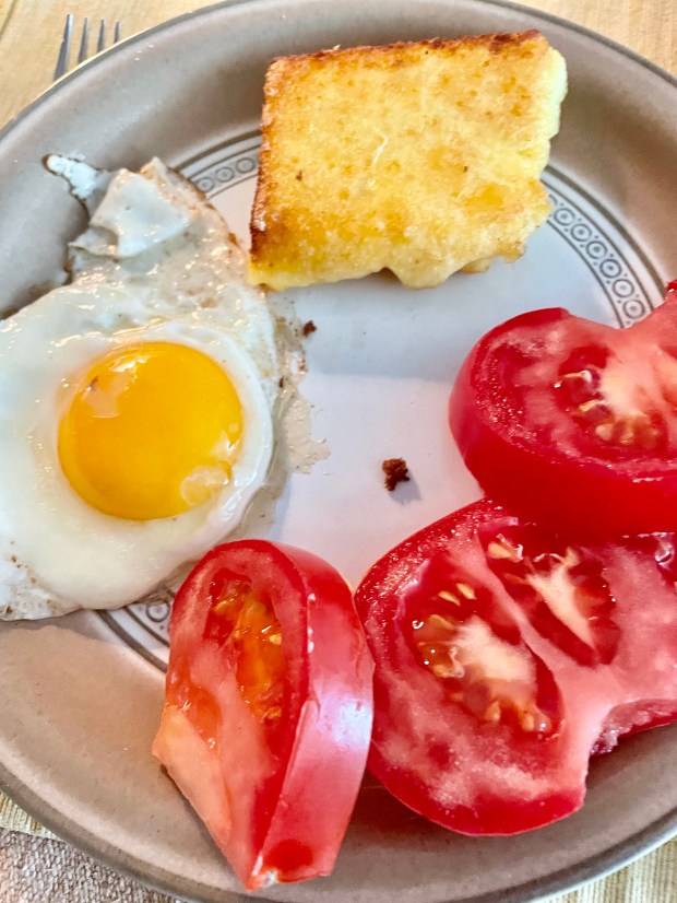Combine luscious, rich – lots of butter, cheese – pan-fried polenta, with slices of beefsteak tomatoes, crunchy toast, creamy eggs, and, bingo, enjoy a great dinner.