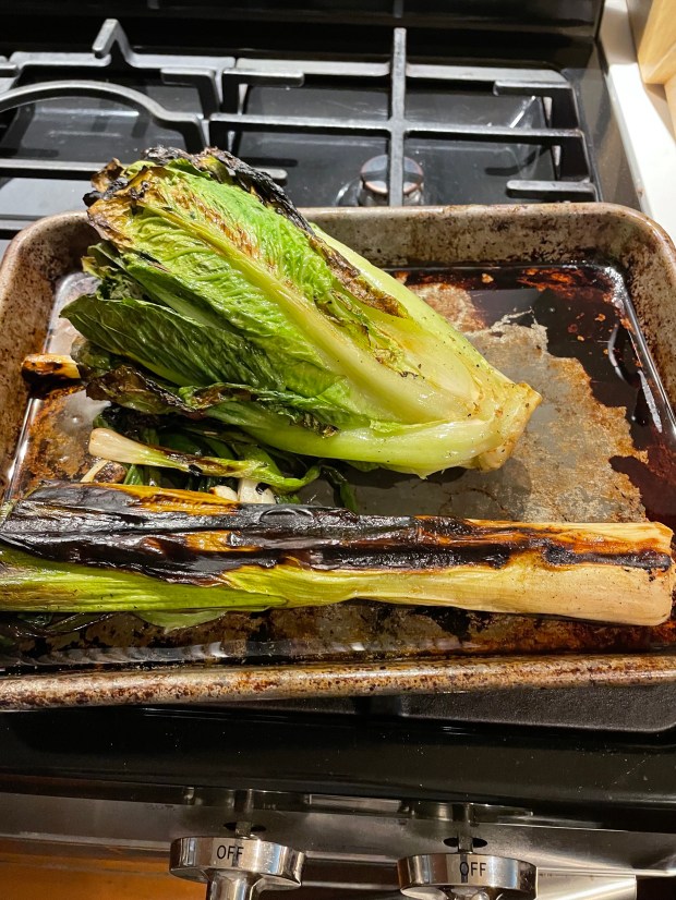 Salt and pepper and then place on your preheated – 400 degrees Farenheit – BBQ and roast the green onions for two minutes, the lettuce for about eight minutes, making sure to turn it over frequently so that all sides are roasted. Then set aside.