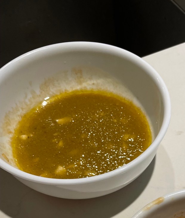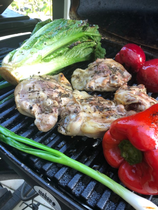 This salad serves two – rich, earthy, a robust dressing, fresh grated, slightly salty Romano-Pecorino cheese, the earthy Romaine lettuce, a bit wilted and with some BBQ char, makes for a superb Caesar salad.