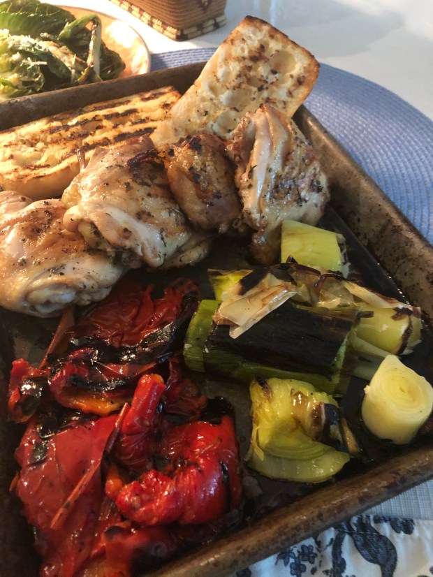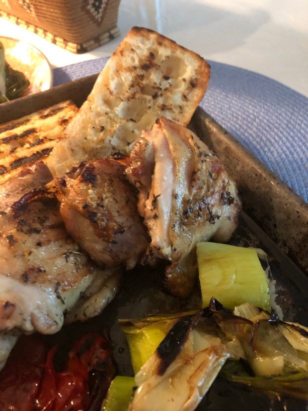 Take your chicken thighs, Bell peppers, leeks, baguette, brush everything with olive and season with salt and pepper. Place everything on the large baking sheet pan, the pan will serve as your tray so everything can be carried out to the BBQ. Put everything on the BBQ in this order. First the chicken. It will take about 35 minutes or a bit longer. Then once the chicken has been on the Barbie for 15 minutes add the Bell peppers and the leeks. After that it’s the baguette – put it on once there is five minutes left for the chicken. Make sure you turn all the items over every once in a while so that they roast evenly.