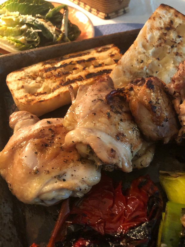 This dinner is for two. And what a special dinner it is – succulent chicken thighs dusted with a blend of Italian spices, the char on the chicken special, added by a robust potato salad, crusty garlic bread. Voila, perfecto, a great dinner awaits you.