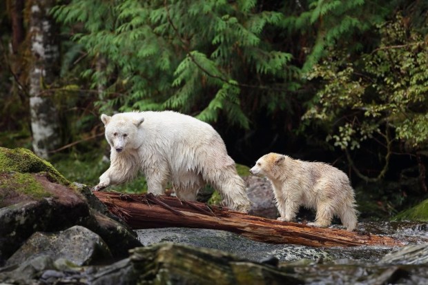 The white bear – a subspecies of the black bear – has naturally white fur. About 10 per cent of the black bears born in this rainforest carry this recessive white gene.