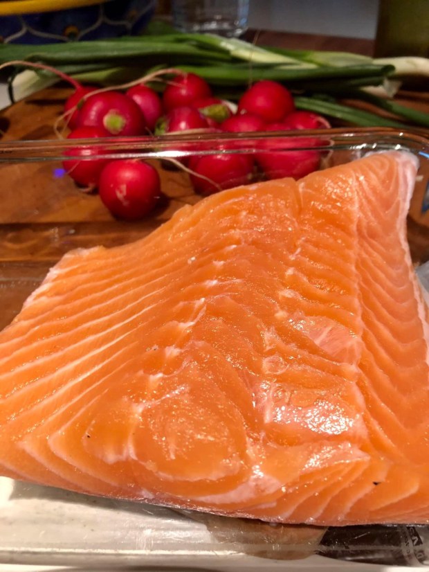 The salmon moist, juicy, the sauce – a hint of ginger, garlic, the zesty green onions add up to something Yummylicious. The steamed asparagus earthy goes well with the rice, the radish salad bright and refreshing.