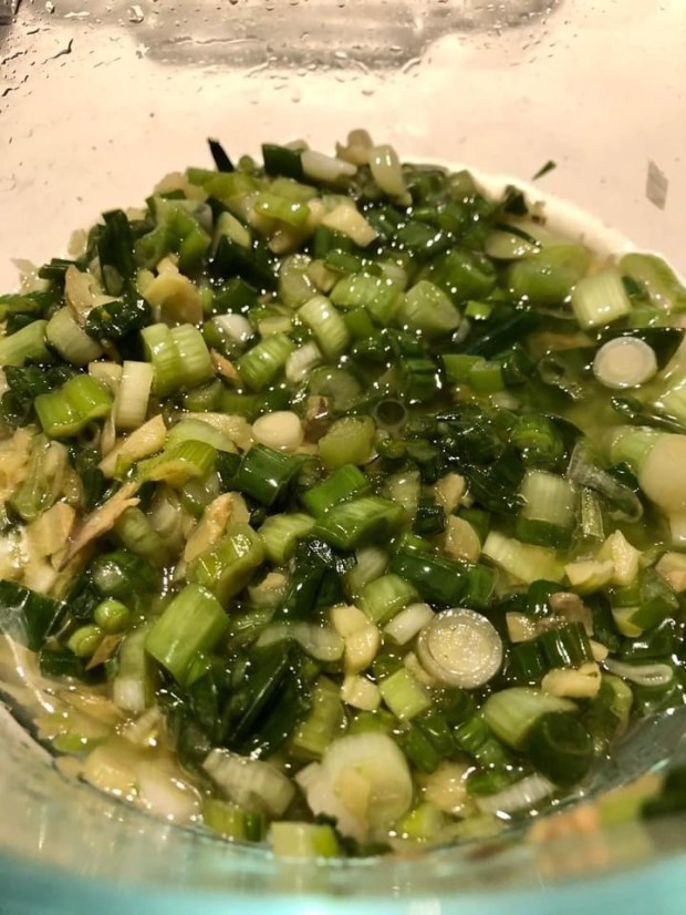 In the small frying pan add your oil and get it hot. Once done pour it over the small bowl with the green onion, ginger and garlic mixture. Let it sit for a few minutes. Then pour it over the salmon, massaging it all over the salmon. Set aside.