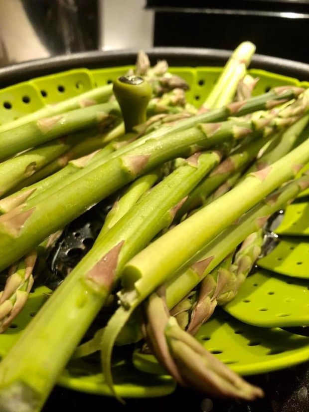 Take your asparagus breaking off the stems and put them into a steaming basket that sits on top of some boiling water in your medium pot. This will take anywhere from 15 to 20 minutes depending on the size of the asparagus. Taste at the 15 minute mark to determine how much longer it will take or if it’s ready.
