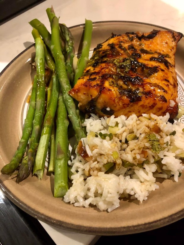 While the rice and the asparagus are cooking start on your salmon – put one tablespoon of vegetable oil it in the large frying pan. Turn the stove to medium heat and once the oil shimmers add the salmon with the marinade and salmon its skin on the bottom. Watch it carefully. You can tell how much of the salmon is cooked by looking at the side of the salmon – what is cooked will show up as being a bit white. Once it reaches the half way mark, using a spatula flip it over and cook for no longer than two minutes. Your salmon is ready and you are ready to serve. There will be a bit of a sauce in the pan, spoon it over the salmon.